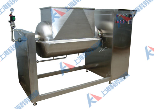横轴卧式搅拌炒锅用于高粘度食品物料预煮、配制,槽形锅体、夹套加热(蒸汽),蜗轮减速机传动横轴搅拌,由变频器及无极调速控制搅拌转速,搅拌器采用聚四氟乙烯浆,刮边(翻滚物料)搅拌,无死角,机械传动卸料、复位。